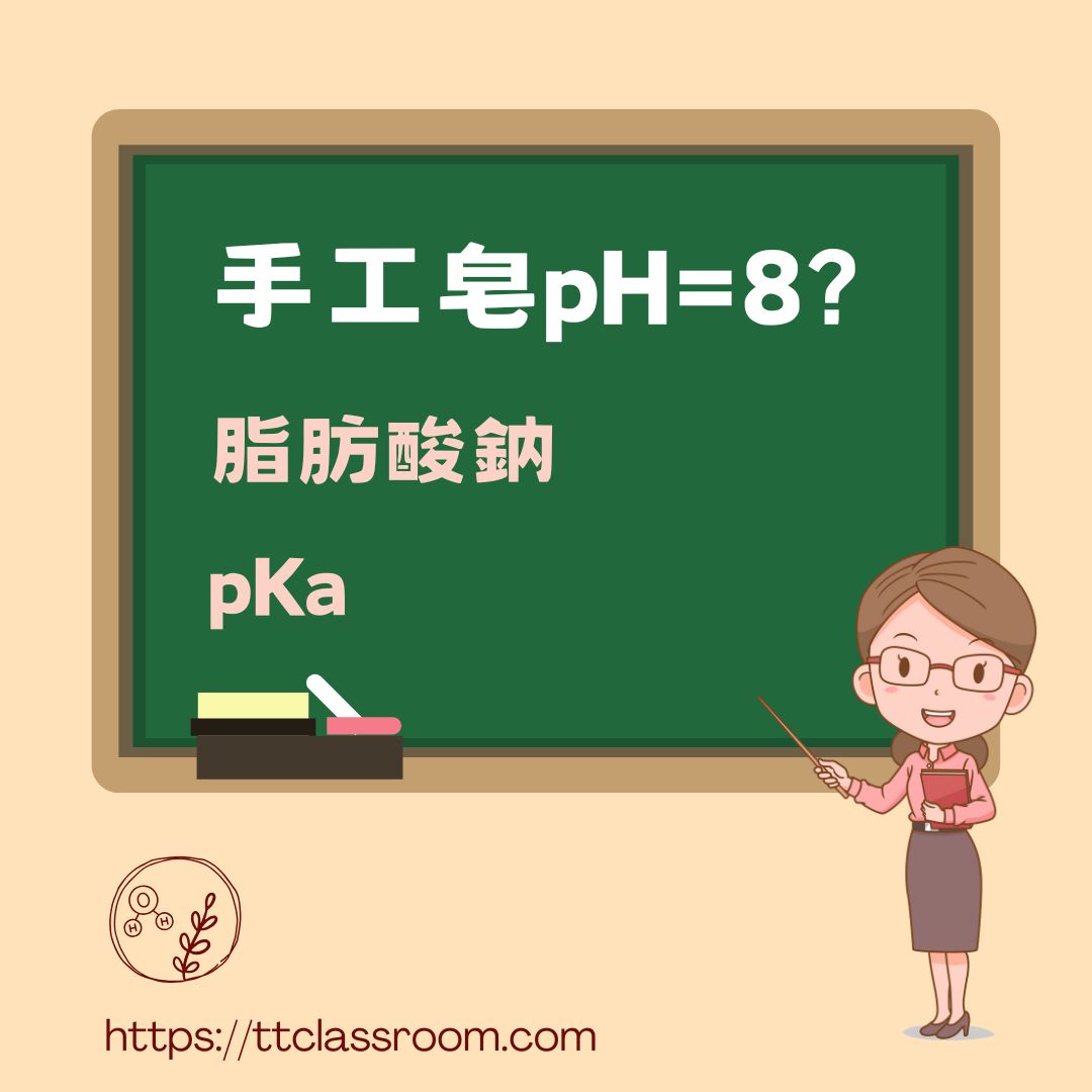 如果確定製作肥皂的氫氧化鈉的量是正確的,那麼影響肥皂酸鹼度的第二個關鍵就是「脂肪酸本身多酸」,也就是脂肪酸的 pKa值。只要知道 pKa,我們就能用高中所學的水解平衡推估肥皂溶液的理論 pH,可以參考上方圖片中的公式。